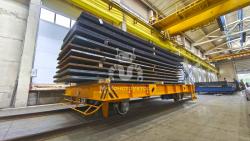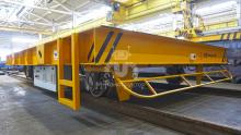 Передаточная тележка грузоподъёмностью 40 тонн предназначена для безопасного и оперативного перемещения железобетонных изделий как внутри производственного цеха, так и на открытую площадку склада.