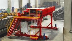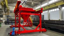 В основе любой портальной машины – самодвижущаяся силовая рама, установленная на рельсовые пути, традиционно расположенные на полу цеха. Однако в текущем проекте бетоноукладчик будет работать на высоте более 3 м, осуществляя подачу бетонной смеси в отсеки кассетной установки типа СМЖ. Такая оторванность от земли требует повышенных мер безопасности, поэтому здесь добавлен пост управления.