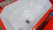 Для этого заглянем в бункер с рабочим объёмом 2 м³ и обнаружим, что в нем нет валов, а вся рабочая поверхность обшита пластиком: так бетону легче покинуть ёмкость. Для придания дополнительного ускорения при раздаче смеси, а также для снижения её прилипания к стенкам снаружи бункера установлен вибратор. Но самое интересное, конечно, затвор, состоящий из двух челюстей с раскрытием до 300 мм. В пределах этих цифр возможно выставить любое промежуточное раскрытие зева.